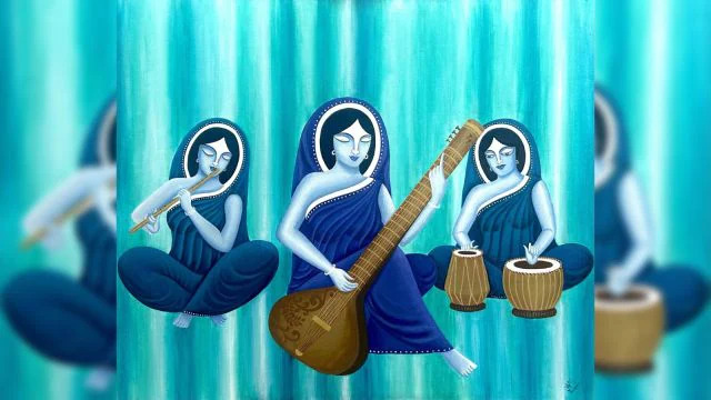 One of the paintings by Pune-based contemporary artist Arpa Mukhopadhyay has three women dressed in traditional saris, with their heads covered, playing on tablas, tanpura, and flute. What is left to the viewer’s imagination is where the women are located as the blue background gives no clue and makes the musicians appear to be floating in the air. “It is as if they are in eternity. They don’t need to belong to a place or time, Music is eternal and they represent music,” says Mukhopadhyay, who will display the work at her first solo show, Timeless Reimaginations, at PN Gadgil in Pune’s Aundh from March 19-26.